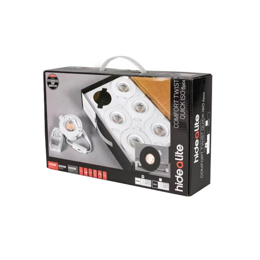 Kätevä 6-pakkaus helpottaa kuljetusta ja vähentää pakkausmateriaalin määrää. Himmennettävä monitoiminen 230V yleisalasvalo Comfort-linssillä. Twist-toiminnon ansiosta sitä voidaan kiertää 2x150° ja valaisinkehystä kallistaa 30° – sopii erinomaisesti, kun haluat suunnata valon tai asentaa sen esimerkiksi avoimeen kattorakenteeseen. Värilämpötila valittavissa ColourTemp-DIP-kytkimellä suoraan valaisimessa. IP44-valaisin, joka soveltuu sisä- ja ulkokäyttöön. Voidaan asentaa suoraan eristettä vasten, 28mm harvalaudoitukseen ja 13mm kipsilevyyn Mukana himmennettävä liitäntälaite, 3-napainen pikaliitin ketjutusta varten sekä vedonpoisto kaapelille tai taipuisalle 16mm:n suojaputkelle. Himmennettävissä markkinoiden tavallisimmilla himmentimillä.