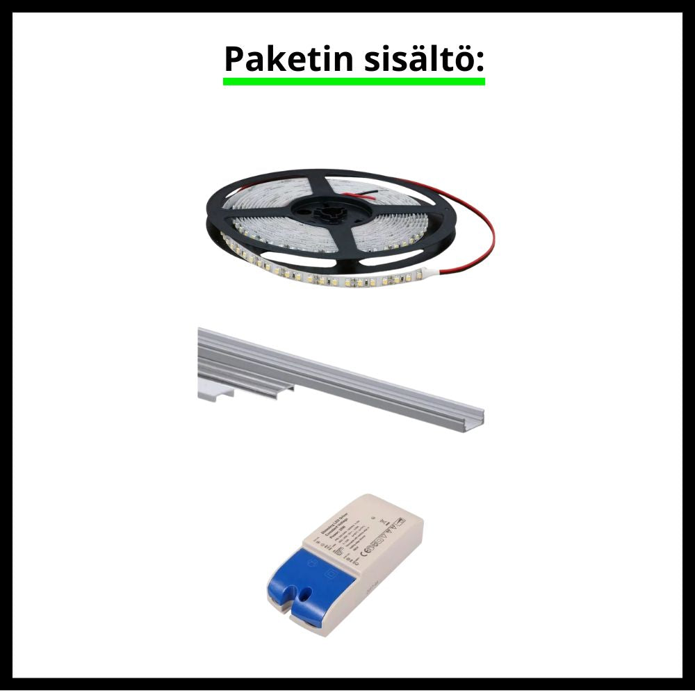 Valmis paketti sisältää 2,5m led-nauhan, 2m alumiiniprofiilin sekä triac-himmennettävän virtalähteen.