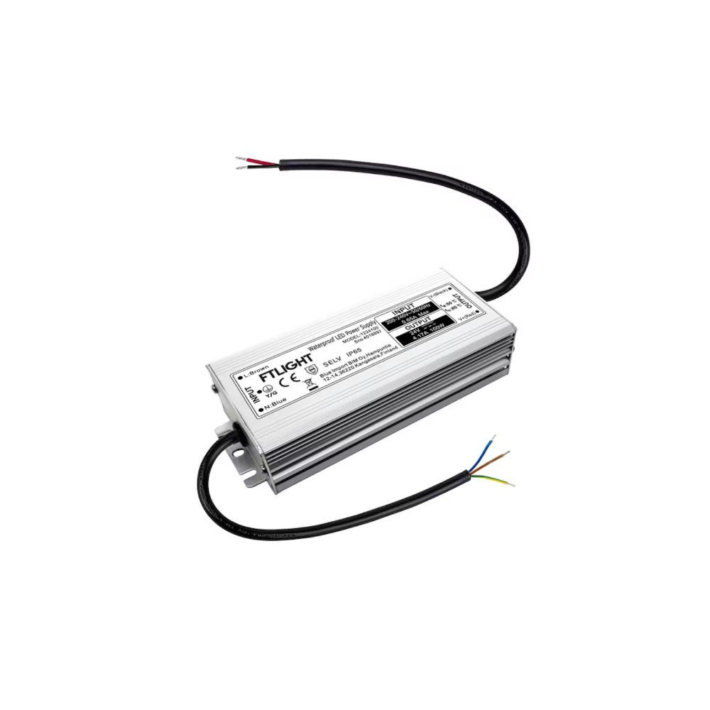 LED vakiojännitelähde FTLIGHT 100W, 24V DC,INPUT AC 220-240 50/60 Hz, IP65, ei himmennettävä.