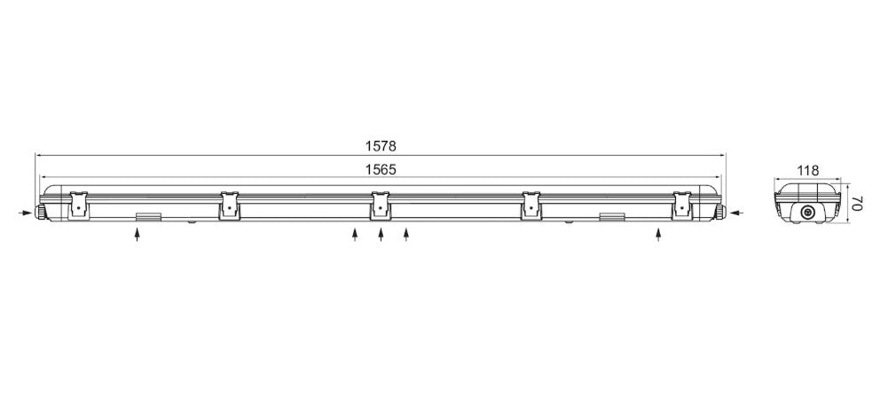 - 1500 mm: 60 W / 9000 lm; 51 W / 7650 lm; 42 W / 6300 lm; 33 W / 4950 lm